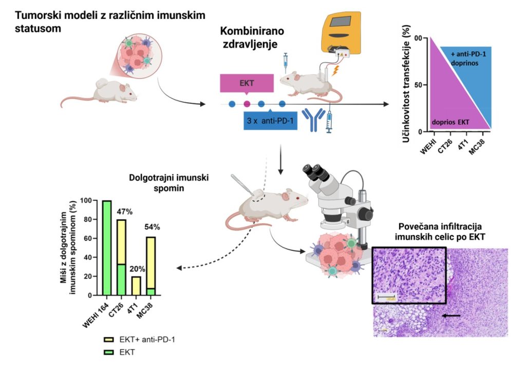V preklinični študiji Omerzel in sod. smo raziskovali protitumorsko učinkovitost kombinacije EKT z bleomicinom in imunoterapije z zaviralcem PD-1 v štirih mišjih tumorskih modelih z različnim imunskim statusom: fibrosarkomu WEHI 164, kolorektalnem karcinomu CT26 in MC38, ter karcinomu dojke 4T1. Cilj raziskave je bil ovrednotiti terapevtski učinek kombiniranega zdravljenja, spremembe v imunskem mikrookolju tumorjev ter sposobnost indukcije dolgotrajnega protitumorskega imunskega spomina.